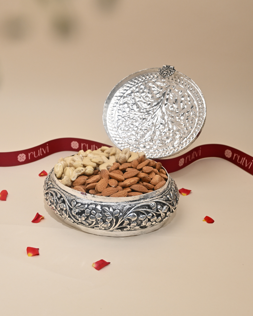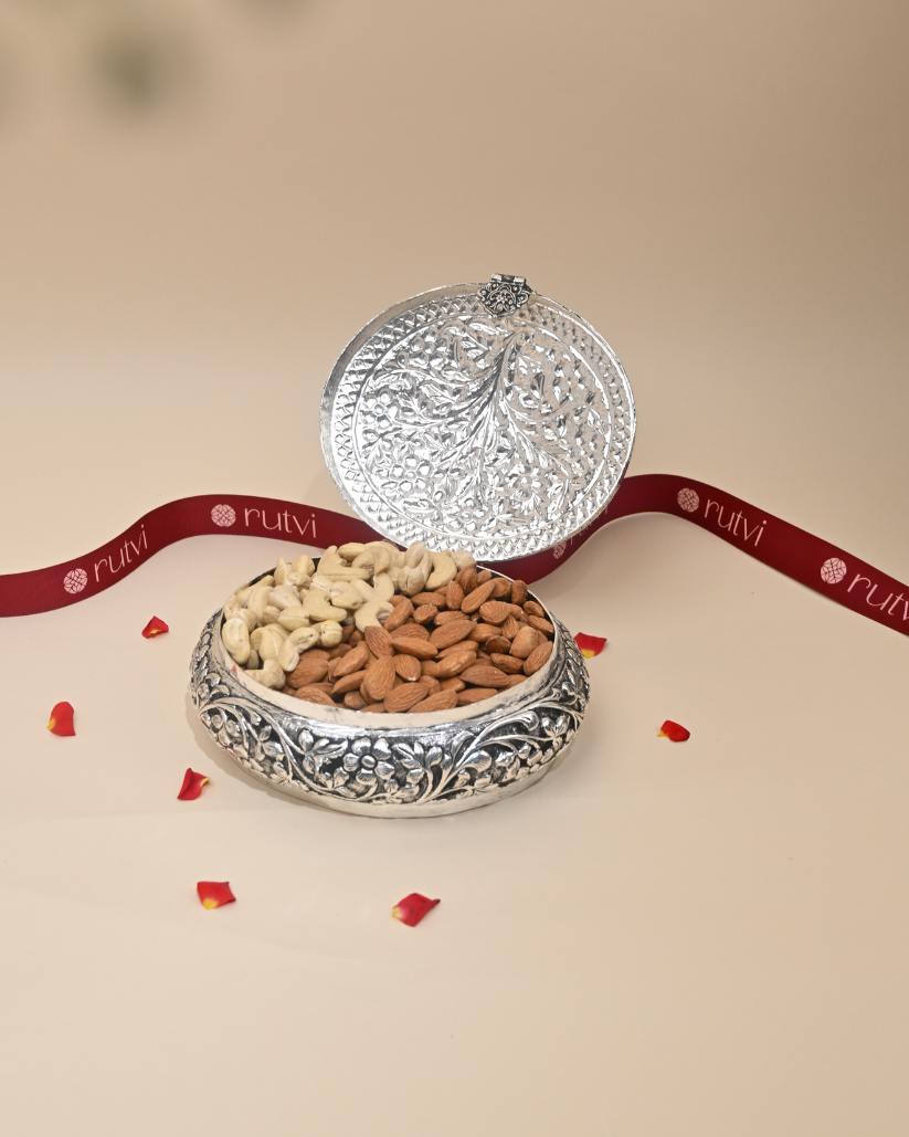Crafted with high-quality German silver, this box seamlessly blends tradition with modern luxury, making it an ideal gift for weddings, anniversaries, and festive occasions. Its sturdy design and smooth finish add a touch of sophistication to any space.