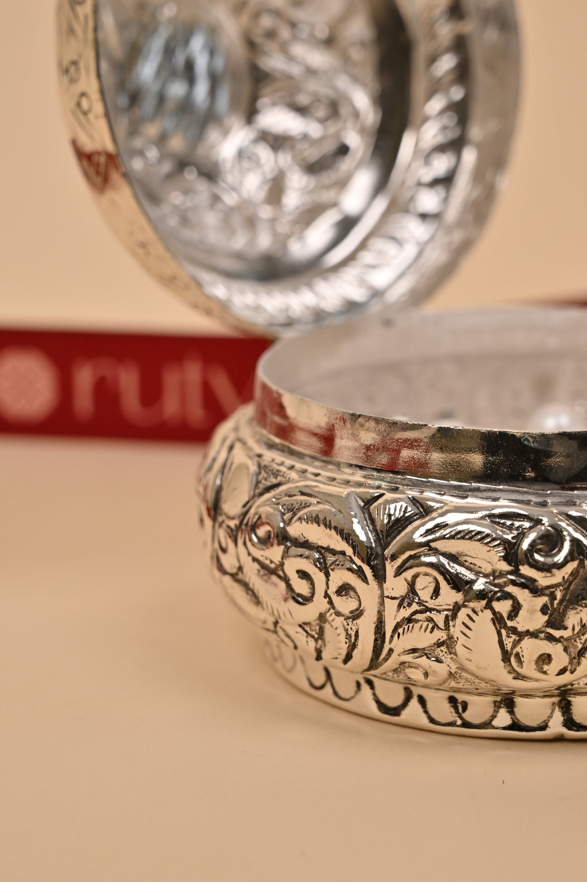 Made from high-quality German silver, this container reflects fine craftsmanship and timeless appeal, making it perfect for Diwali gifting, weddings, anniversaries, or home décor.