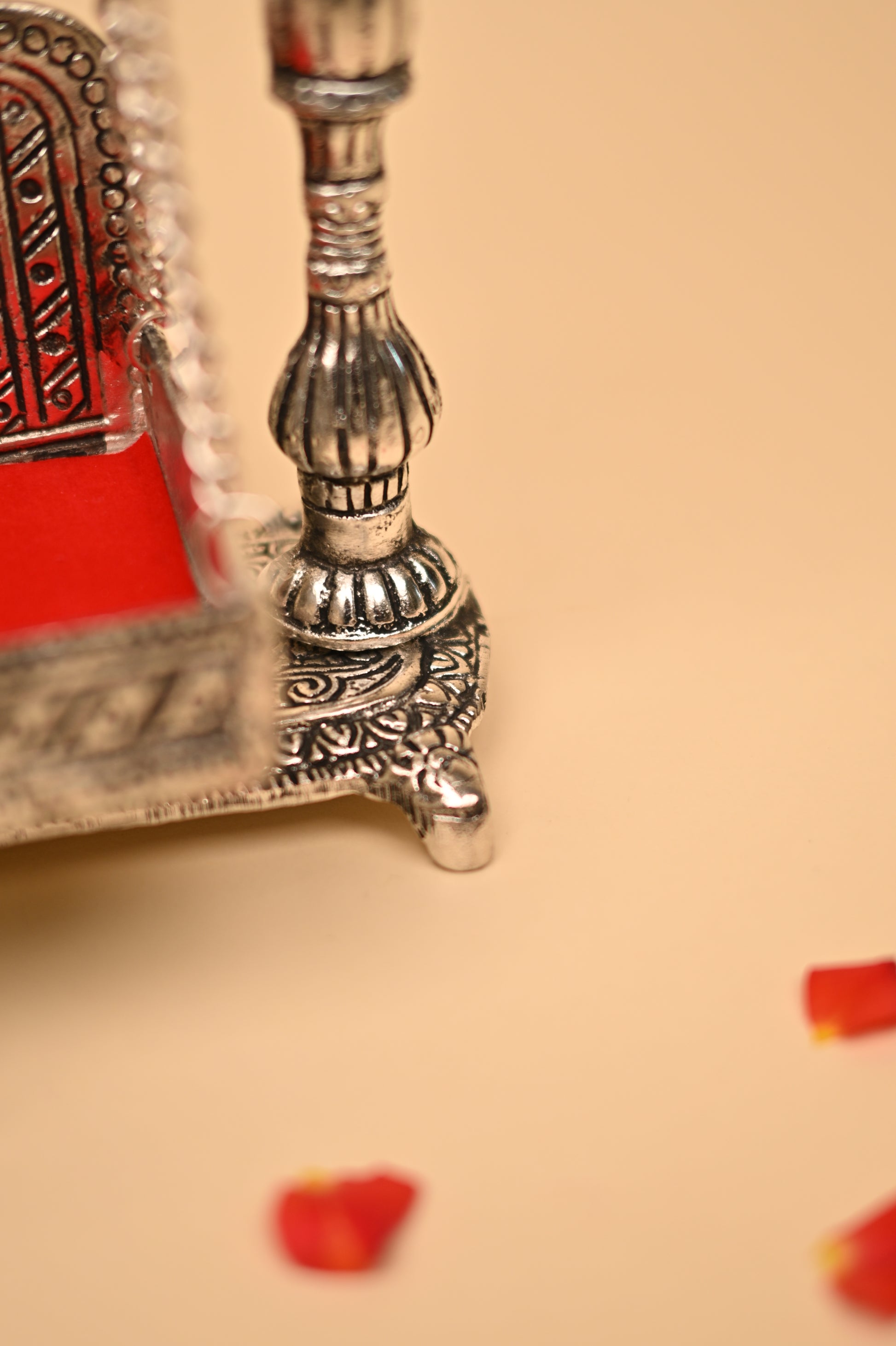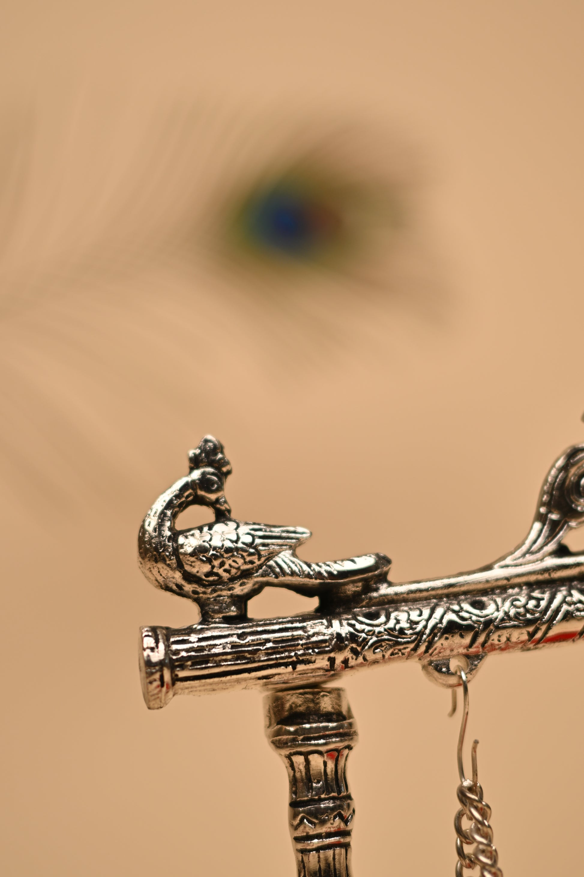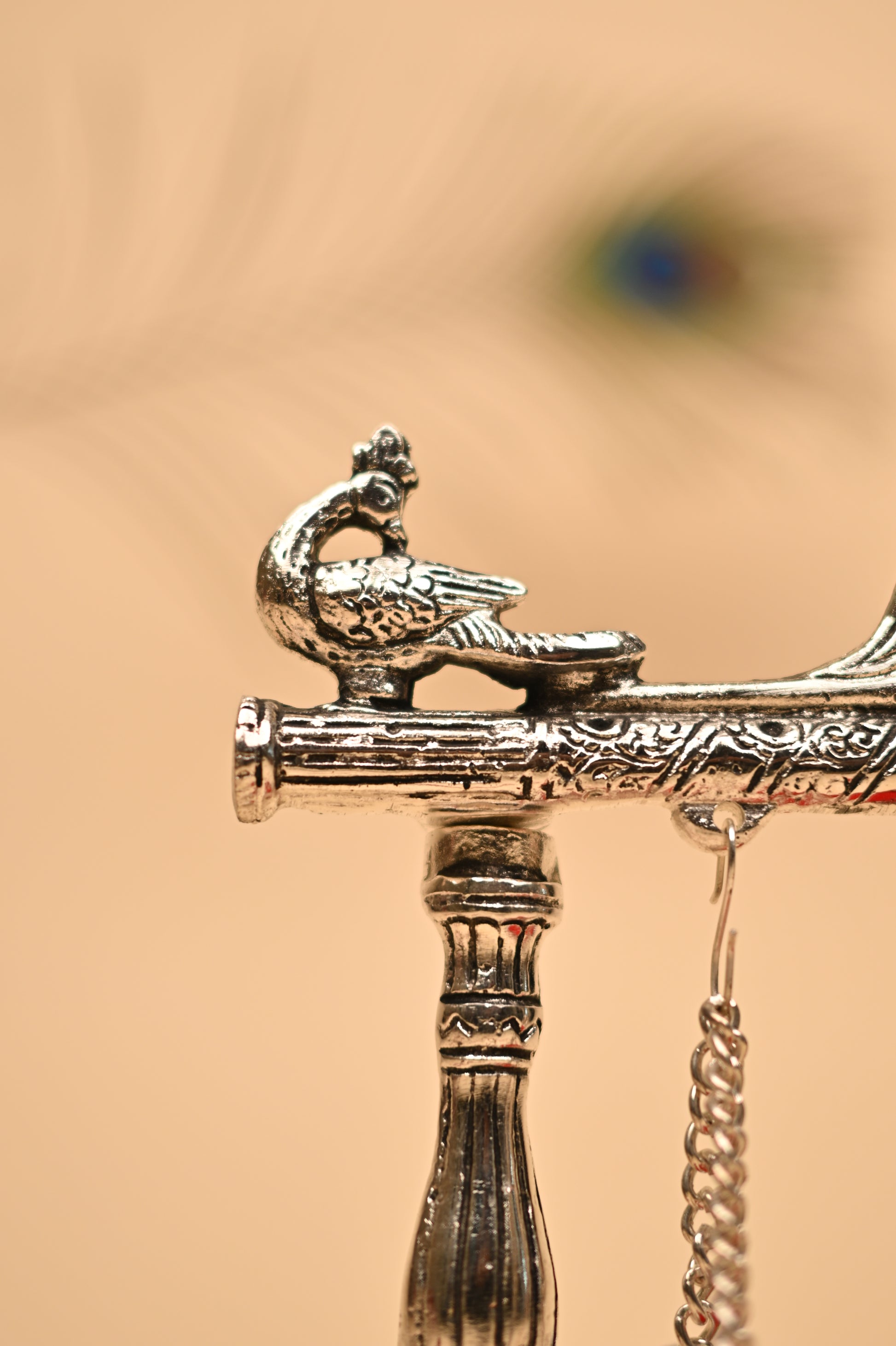 Bring home grace and tradition with this handcrafted German Silver Peacock Feather Jula, beautifully detailed with delicate peacock feather motifs and an elegant swing. Symbolizing prosperity, devotion, and cultural artistry, this piece is perfect for pooja rituals, festive décor, and home temple use.