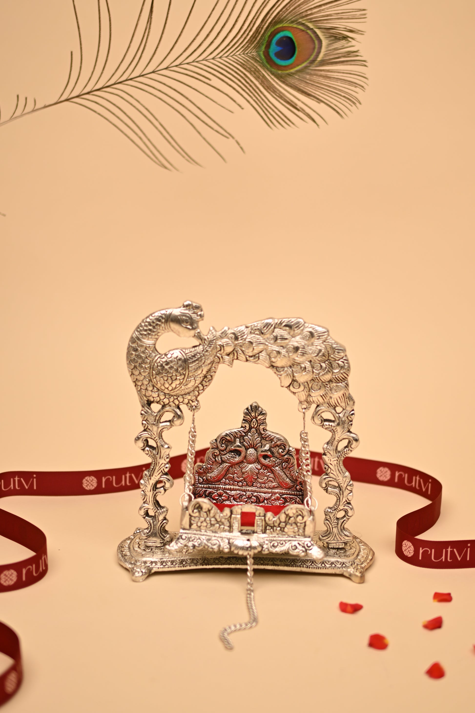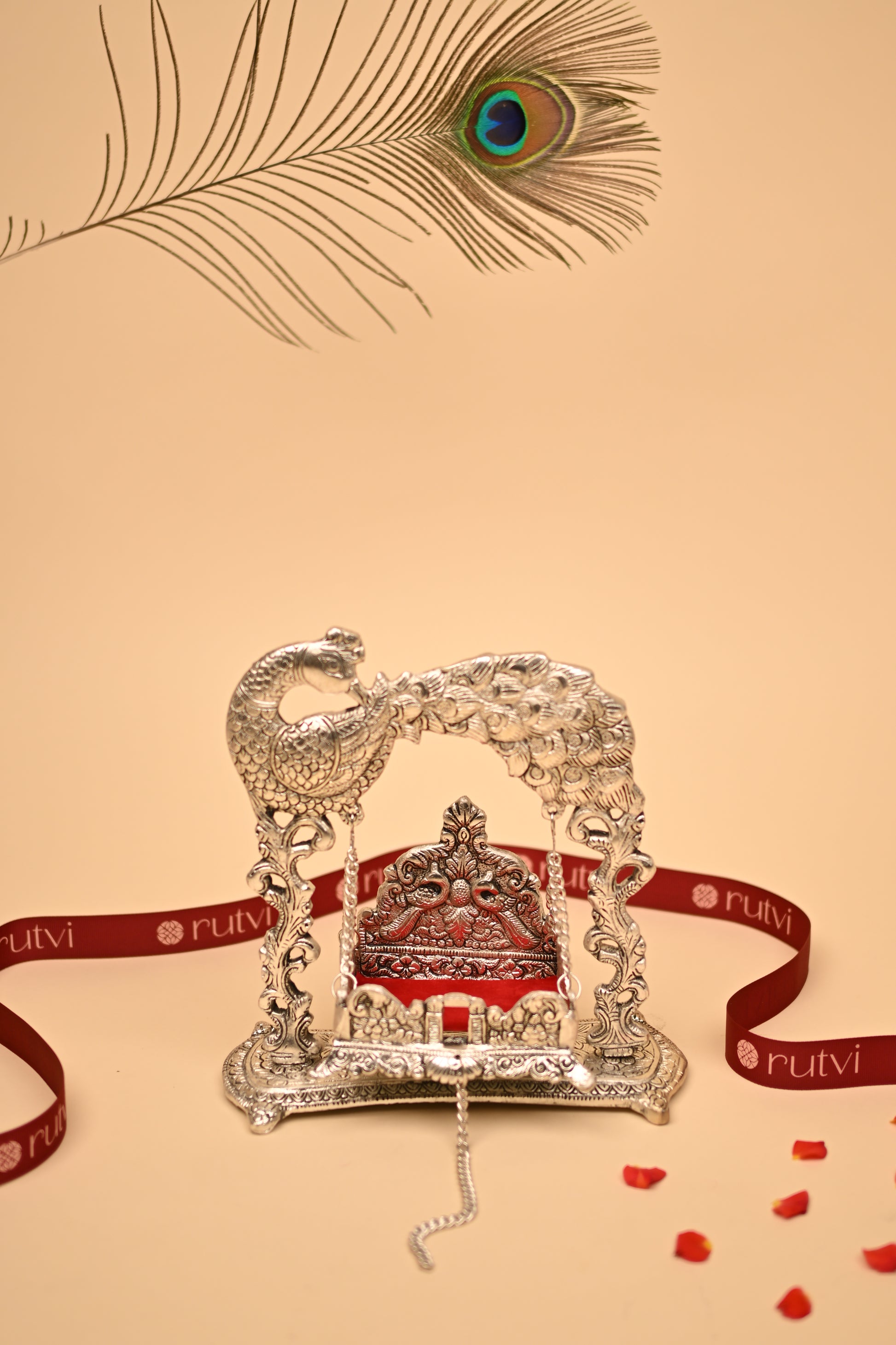 Add elegance and devotion to your home with this handcrafted German Silver Peacock Jula, featuring beautifully detailed peacock motifs and a symbolic swing. Perfect for pooja rituals, festive décor, and home temple use, this piece blends cultural artistry with sacred symbolism.