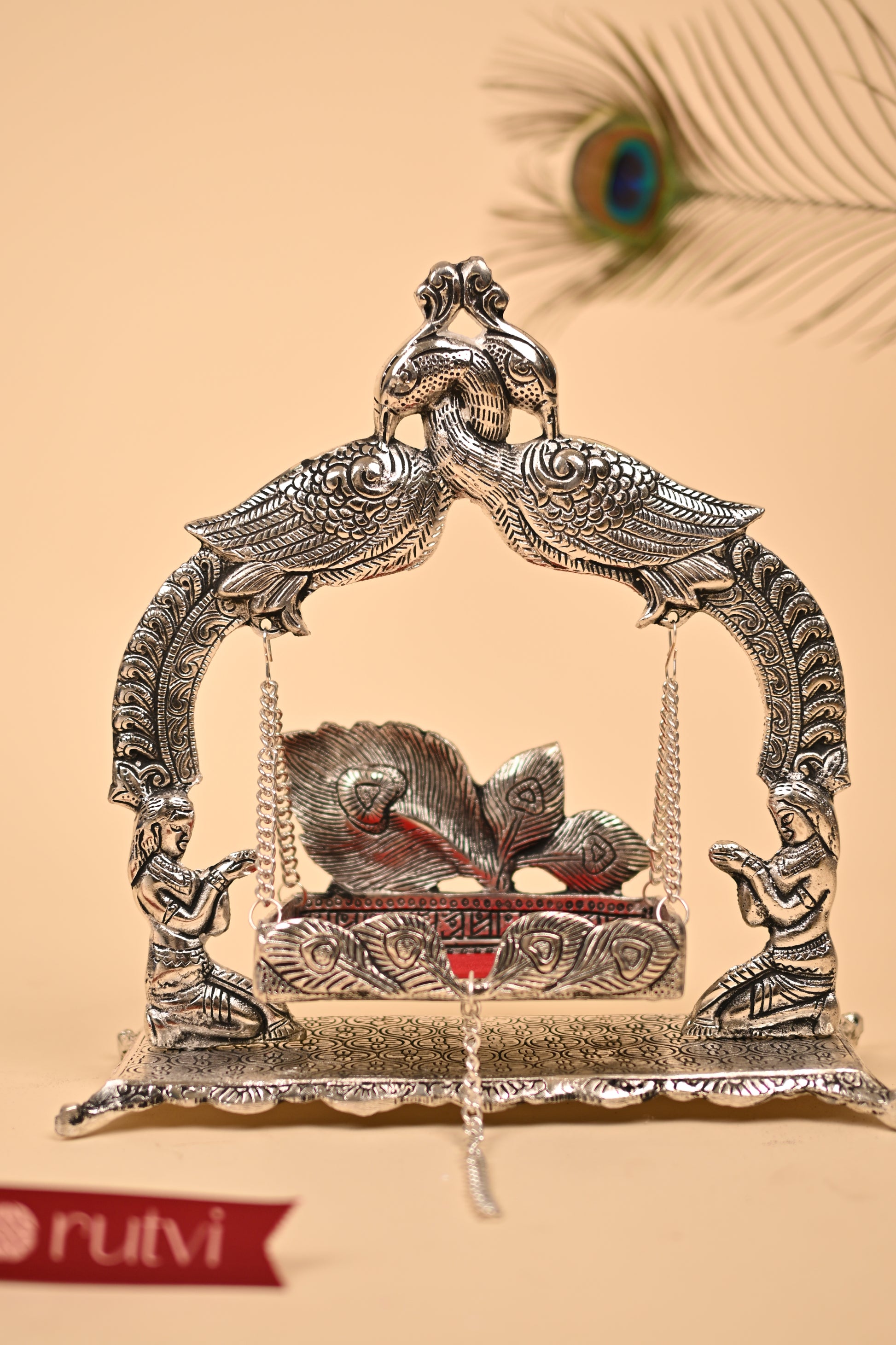 Adorn your home with this handcrafted German Silver Peacock Jula, intricately designed with peacock motifs and a symbolic swing. Representing beauty, prosperity, and devotion, this piece is perfect for pooja rituals, festive décor, and home temple use.