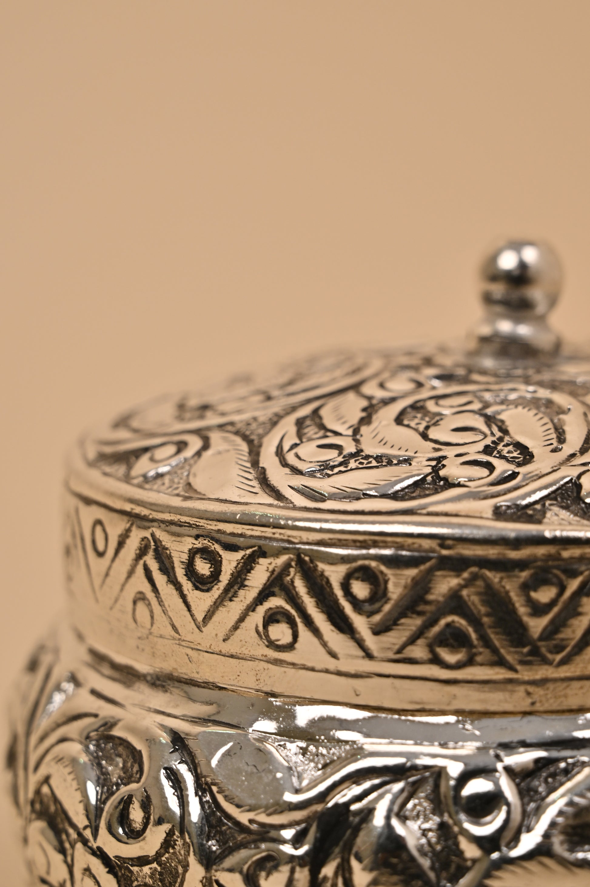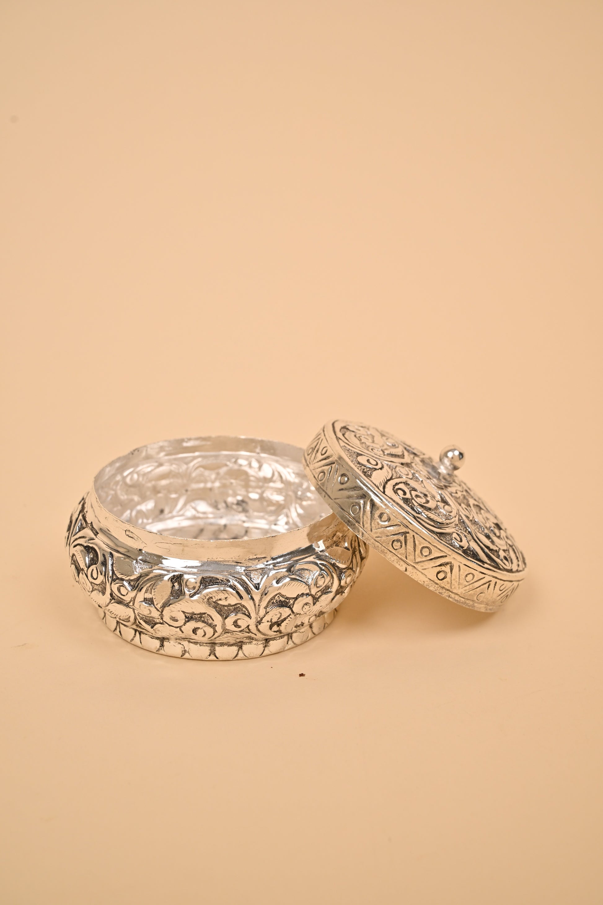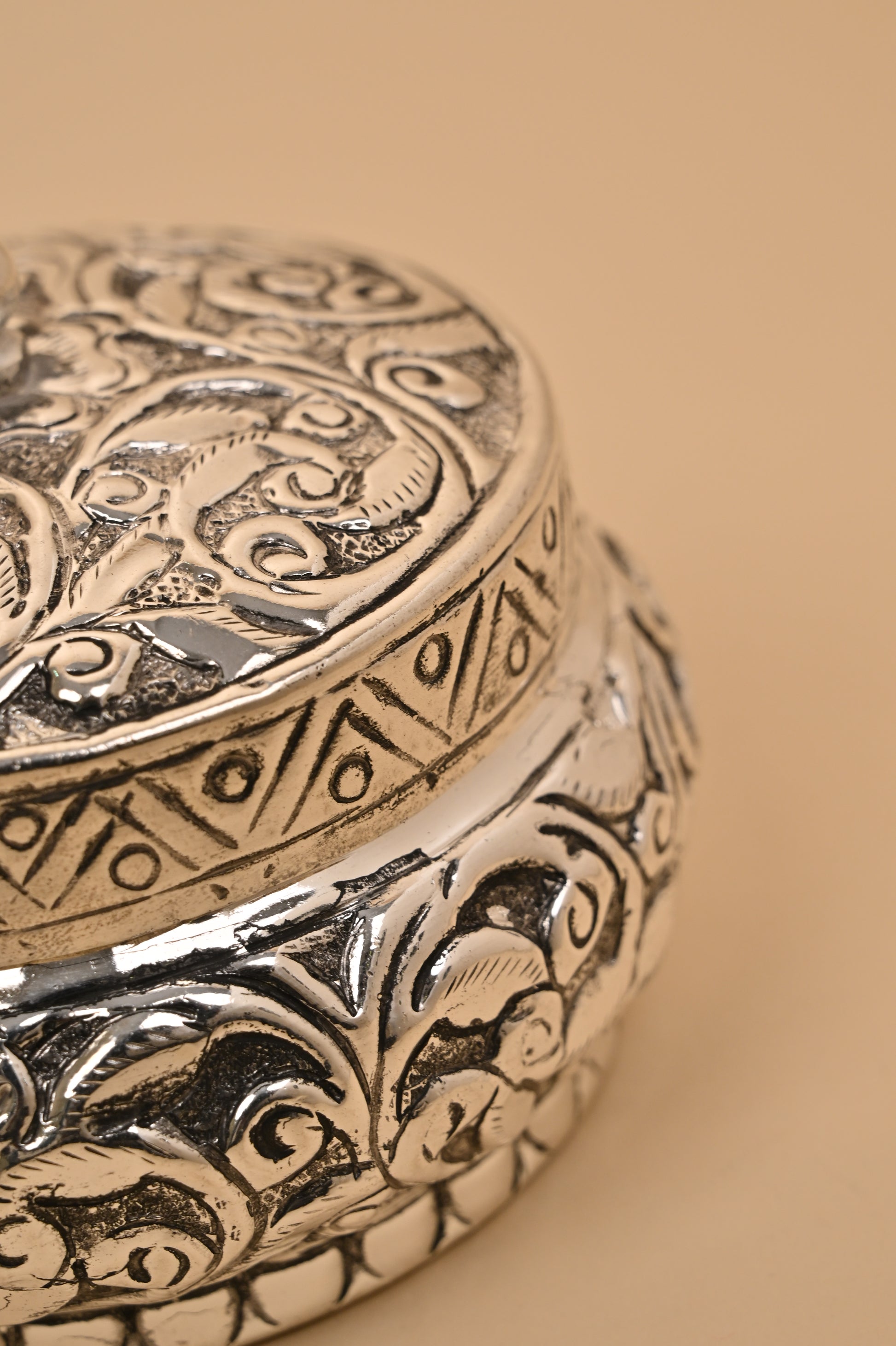 Keep your essentials safe in style with this handcrafted German Silver Round Box, designed with traditional artistry and a polished silver finish. Perfect for storing jewelry, pooja items, dry fruits, or keepsakes, it combines elegance with utility.
