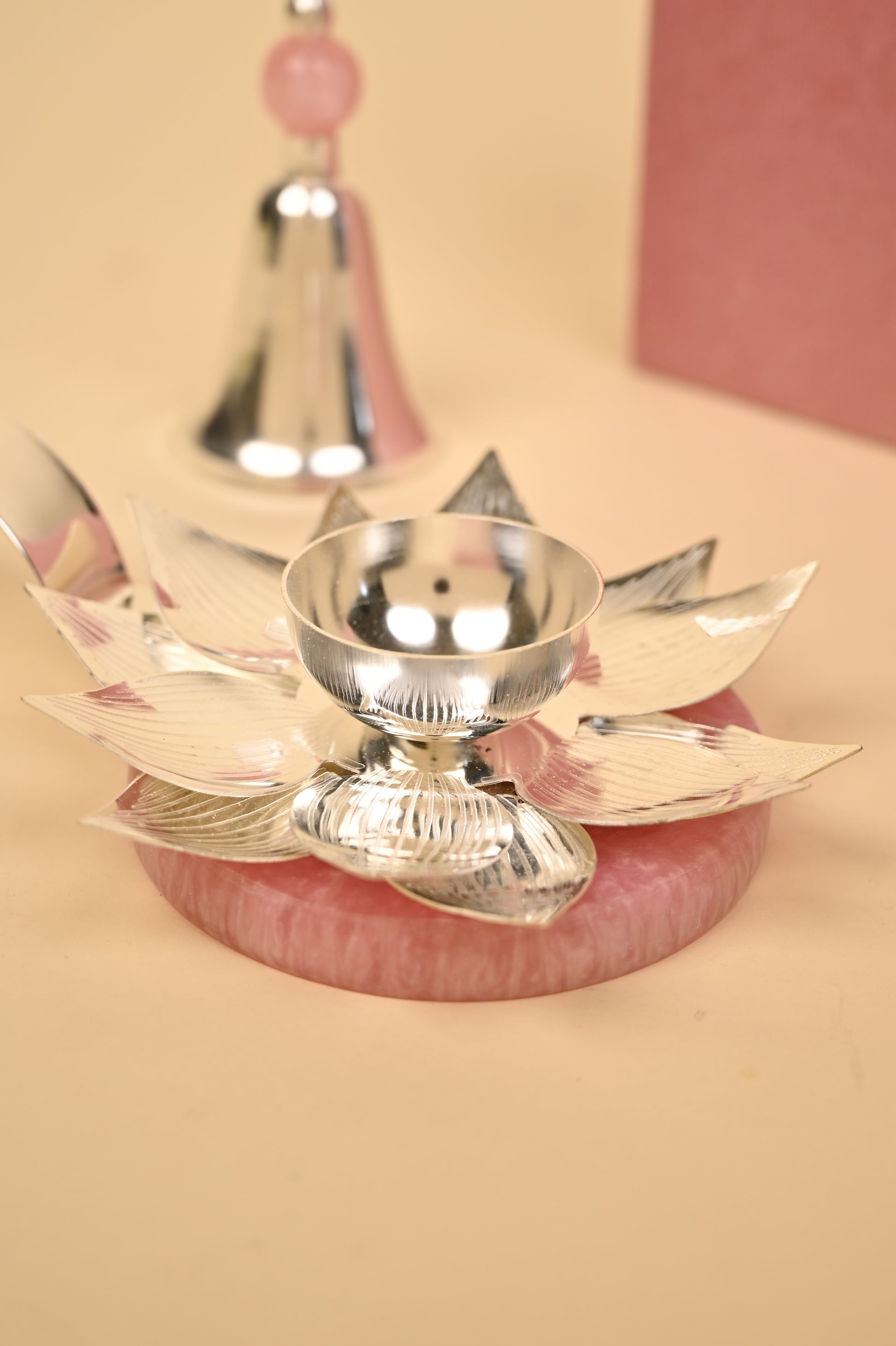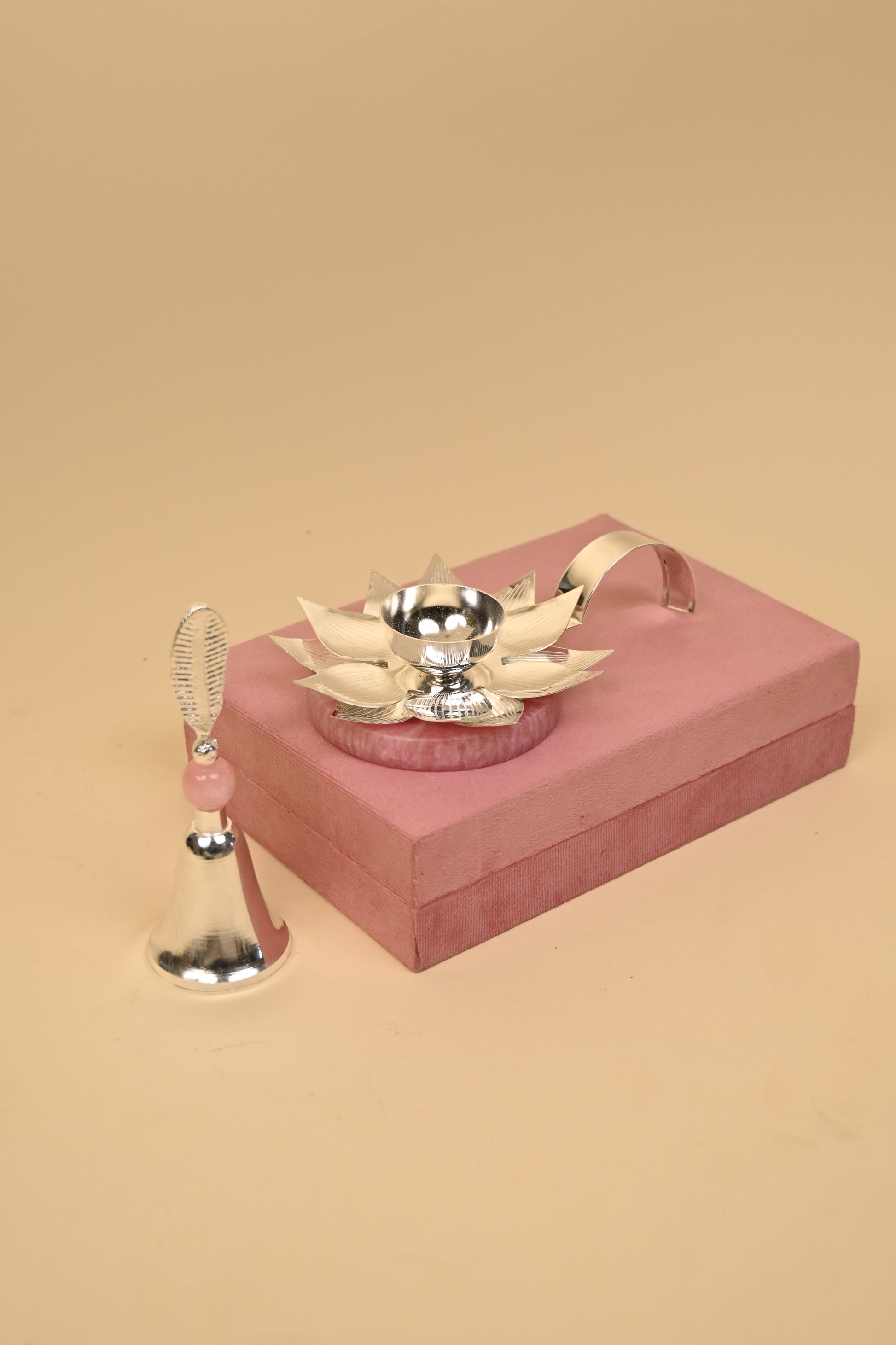 Lotus Diya and Bell Set in German Silver – Handcrafted Pooja Essentials for Auspicious Rituals
