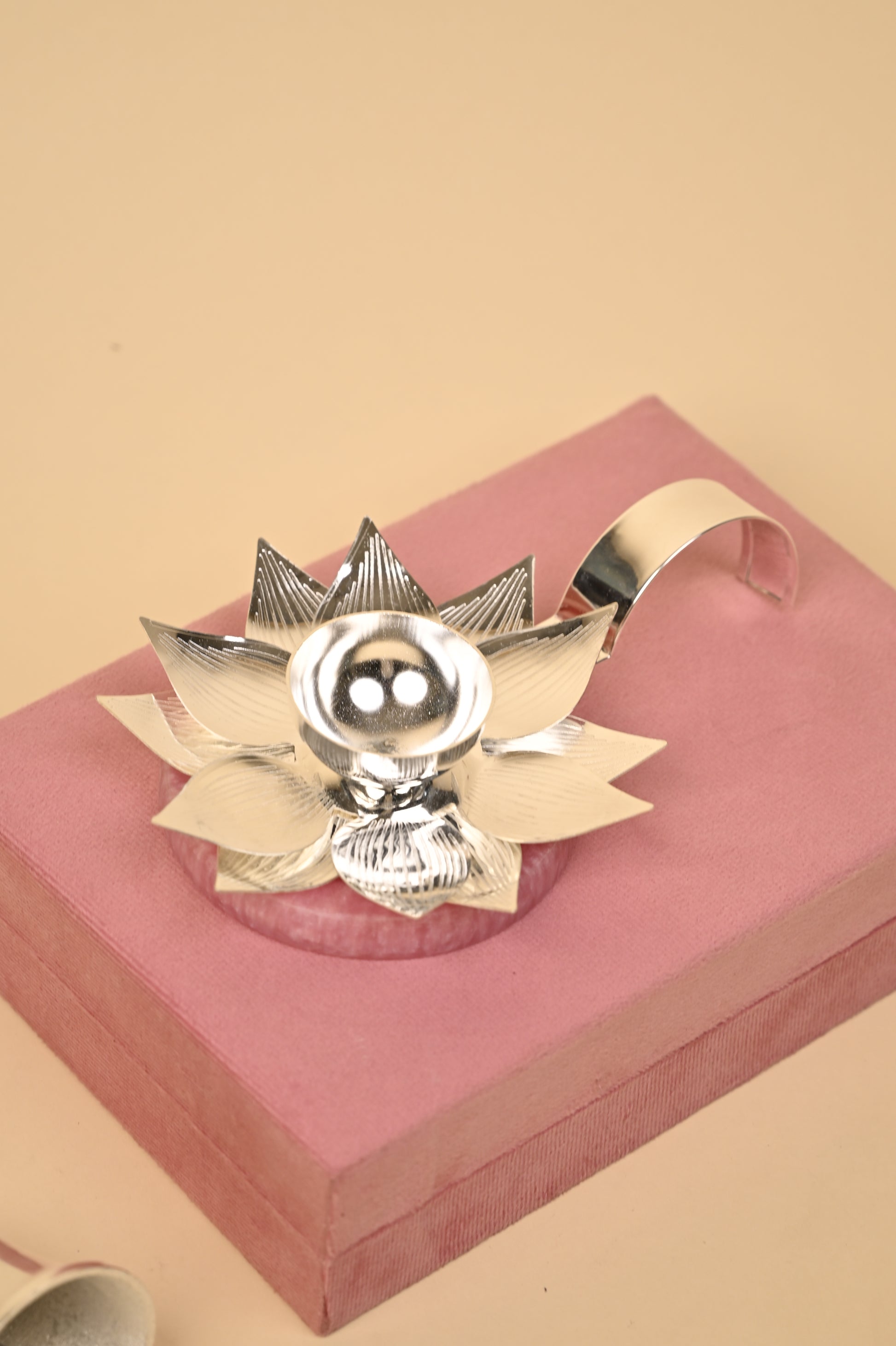 A beautifully handcrafted Lotus Diya and Bell Set made from premium German silver, designed to elevate your pooja rituals. The lotus-shaped diya represents purity and divine light, while the intricately carved bell (ganta) signifies auspicious beginnings. This elegant duo adds a touch of devotion and sophistication to your sacred space, making it perfect for daily worship or festive ceremonies.