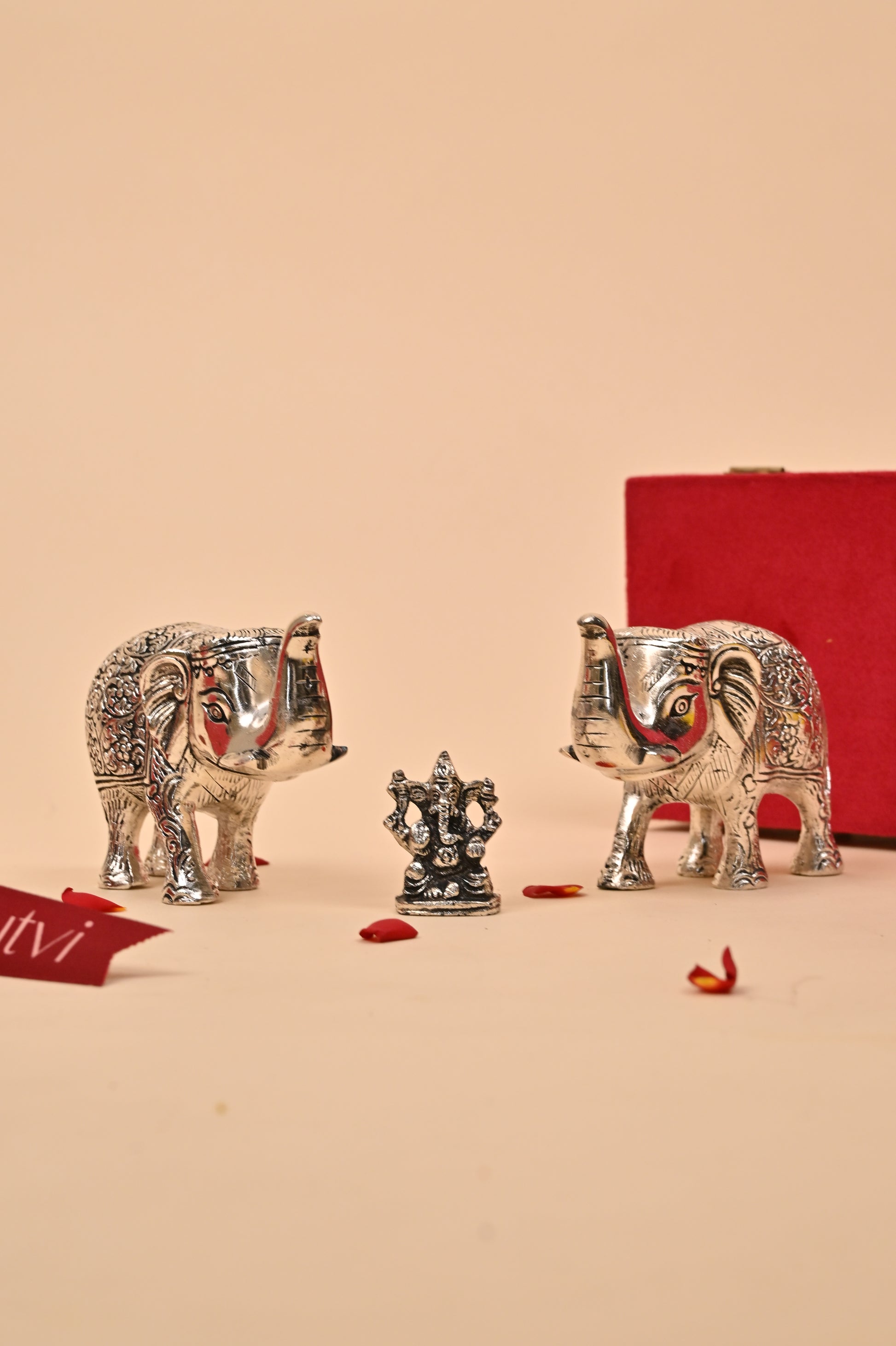 Bring home divine blessings with this German Silver Elephant Pair with Mini Ganesha Idol. Handcrafted with intricate detailing, the majestic elephants symbolize strength, prosperity, and wisdom, while Lord Ganesha represents success and the remover of obstacles.