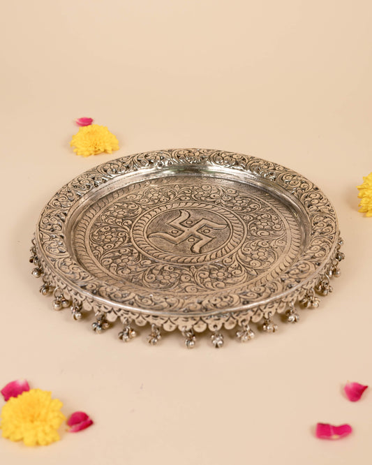 German Silver Pooja Thali with Colorful Tassels – A Perfect Blend of Tradition & Elegance